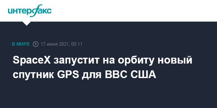 Москва. 17 июня. INTERFAX.RU - Тяжелая ракета-носитель Falcon 9 в четверг должна вывести на орбиту очередной спутник системы глобального позиционирования третьего поколения GPS III в интересах ВВС США, сообщает компания-разработчик носителя SpaceX.