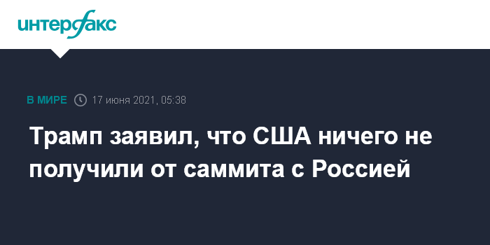 Москва. 17 июня. INTERFAX.RU - Бывший президент США Дональд Трамп заявил, что США от встречи президента Джо Байдена с российским лидером Владимиром Путиным ничего не получили.