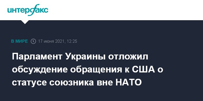 Москва. 17 июня. INTERFAX.RU - Верховная рада Украины перенесла на осень проект постановления об обращении парламента к Конгрессу США относительно предоставления Украине двустороннего статуса основного союзника Штатов вне НАТО (MNNA) (№ 5380), сообщил глава фракции "Слуга народа" Давид Арахамия.