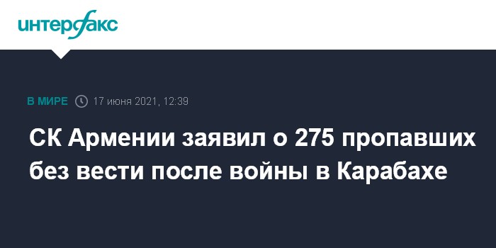 Москва. 17 июня. INTERFAX.RU - Количество без вести пропавших военнослужащих и гражданских лиц с армянской стороны после войны в Нагорном Карабахе составляет 275 человек. Об этом сообщил в четверг Следственный комитет Республики Армения.
