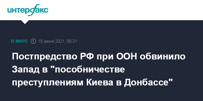 Москва. 18 июня. INTERFAX.RU - Постпредство РФ при ООН заявило об озабоченности в связи с тем, что Запад практически пособничает преступной деятельности Киева в Донбассе.