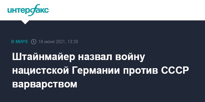 Москва. 18 июня. INTERFAX.RU - Президент ФРГ Франк-Вальтер Штайнмайер заявил, что война нацистской Германии против СССР была варварством и что немцы недостаточно знают об ужасах этой войны.