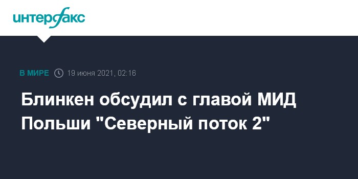 Москва. 19 июня. INTERFAX.RU - Госсекретарь США Энтони Блинкен провел телефонный разговор с министром иностранных дел Польши Збигневом Рау, в ходе которого обсудил тему газопровода "Северного потока 2", сообщает Госдеп.
