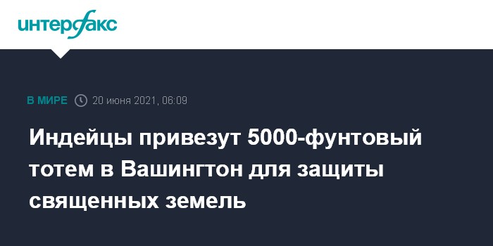 Москва. 20 июня. INTERFAX.RU - Индейцы собираются привезти 5000-фунтовый (около 2268 кг) тотемный столб в столицу США Вашингтон из штата Вашингтон, чтобы обратить внимание на проблему защиты земель, которые они считают священными. Об этом сообщает Washington Post.