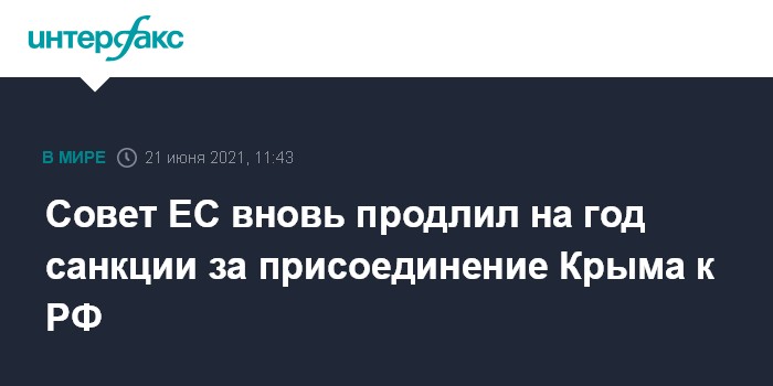 "Сегодня Совет решил продлить санкции, введенные в ответ на незаконную аннексию Крыма и Севастополя Российской Федерацией, на последующий год - до 23 июня 2022 года", - говорится в коммюнике Совета ЕС.