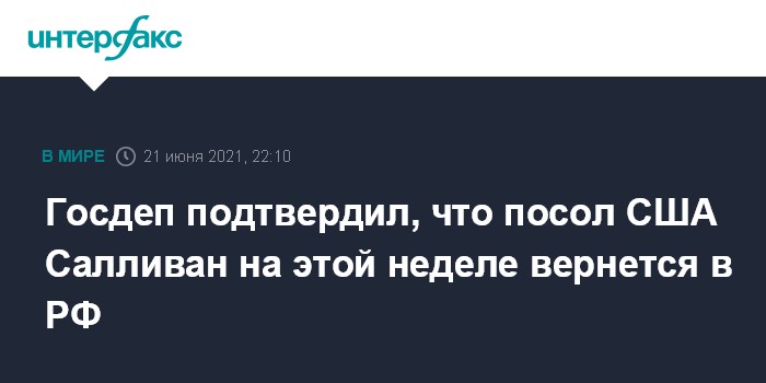 Москва. 21 июня. INTERFAX.RU - Посол США Джон Салливан на этой неделе вернется в Россию, сообщил в понедельник представитель госдепа Нед Прайс.