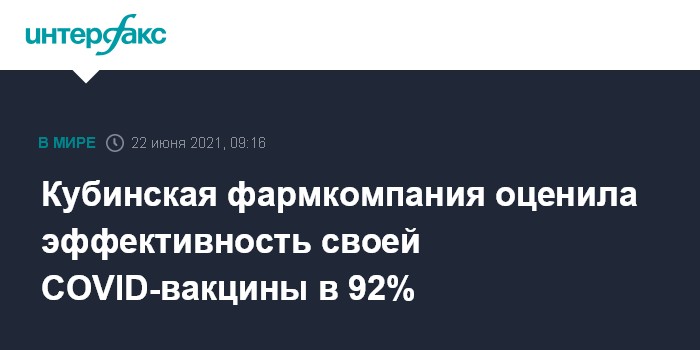 Москва. 22 июня. INTERFAX.RU - Трехдозовая вакцина "Абдала 92" кубинского производства эффективна от коронавируса на 92%, сообщила к компания "БиоКубаФарма".