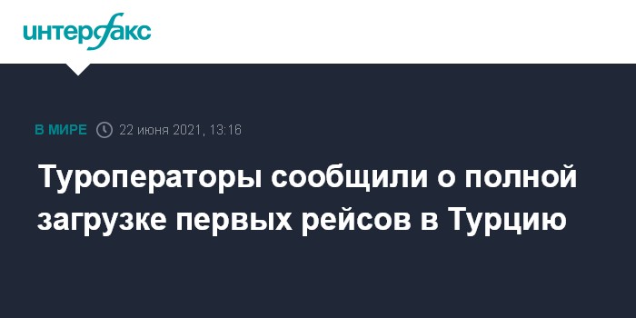 Москва. 22 июня. INTERFAX.RU - Загрузка первых чартерных рейсов в Турцию, вылетающих после отмены ограничений на авиасообщение во вторник, практически 100%-ая, на них летят в том числе и туристы, чей отдых был перенесен из-за ограничений, сообщили порталу "Интерфакс-Туризм" туроператоры.