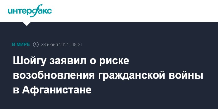 Москва. 23 июня. INTERFAX.RU - После вывода сил НАТО из Афганистана с высокой вероятностью там можно ожидать возобновления гражданской войны, заявил министр обороны РФ Сергей Шойгу.