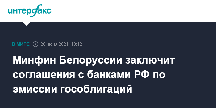 Москва. 26 июня. INTERFAX.RU - Министерство финансов Белоруссии заключит соглашения с десятью российскими банками об оказании услуг по эмиссии гособлигаций, соответствующее постановление Совмина №358 опубликовано на Национальном правовом интернет-портале в субботу.