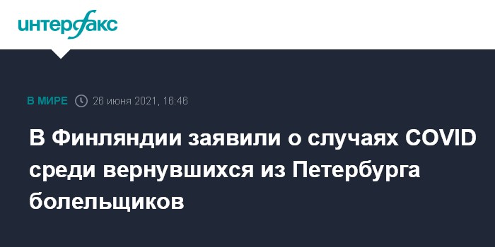 Москва. 26 июня. INTERFAX.RU - Данные департамента здравоохранения и социального развития Финляндии THL свидетельствуют, что число вернувшихся из Санкт-Петербурга жителей Финляндии, у которых обнаружили коронавирусную инфекцию, активно растет.