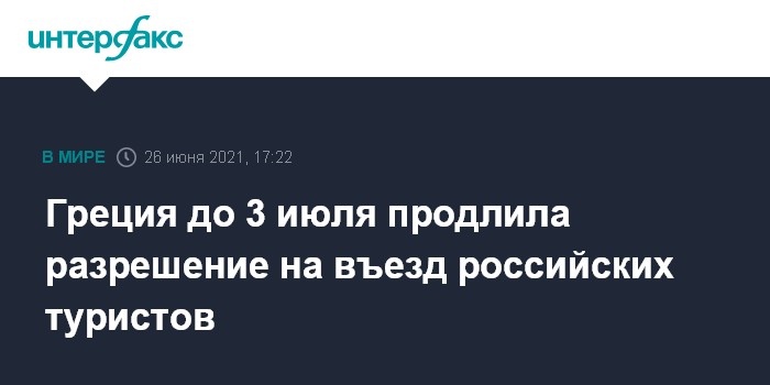 Москва. 26 июня. INTERFAX.RU - Власти Греции продлили до 3 июля разрешение на въезд для российских туристов с прививкой, тестом или справкой о наличии антител, сообщает правительственный вестник.