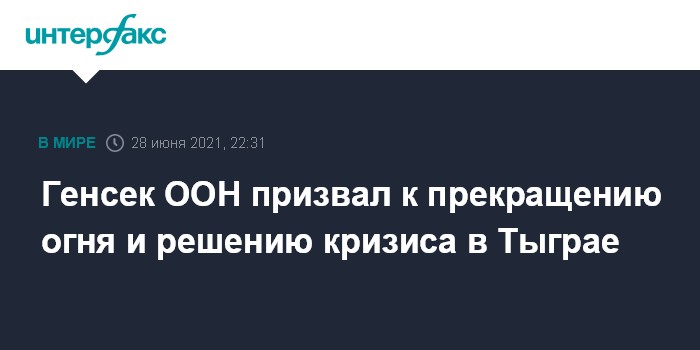 Москва. 28 июня. INTERFAX.RU - Генсек ООН Антониу Гутерриш в понедельник заявил, что рассчитывает на реальное прекращение боевых действий в эфиопском регионе Тыграй, и призвал к политическому решению кризиса.