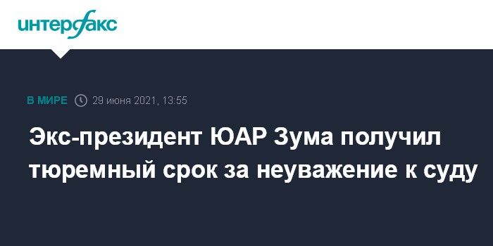 Москва. 29 июня. INTERFAX.RU - Конституционный суд ЮАР, высший суд страны, приговорил экс-президента Джейкоба Зуму к 15 месяцам тюрьмы за неуважение к суду, сообщает BBC News.
