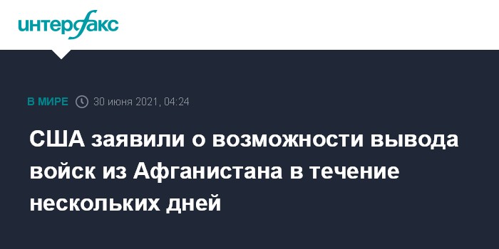 Москва. 30 июня. INTERFAX.RU - Соединенные Штаты могут завершить начавшийся процесс вывода своих войск из Афганистана в течение нескольких дней, сообщил телеканал CNN, ссылаясь на источники из числа официальных лиц.