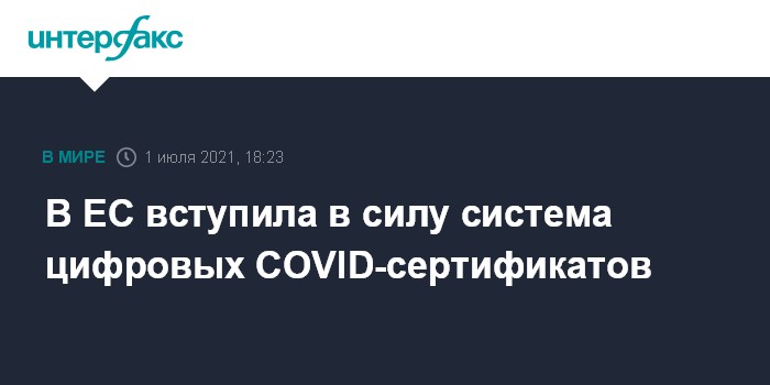 Москва. 1 июля. INTERFAX.RU - В Европейском союзе с четверга вступил в силу регламент о цифровых сертификатах COVID-19, которые должны позволить гражданам и резидентам ЕС свободно передвигаться по всей территории союза и шенгенского пространства.