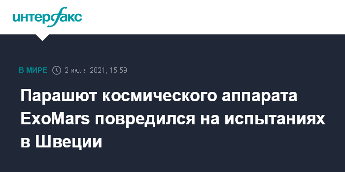 Москва. 2 июля. INTERFAX.RU - Парашют второй ступени российско-европейского космического аппарата ExoMars получил повреждение при проведении испытаний в Швеции, сообщает "Роскосмос".