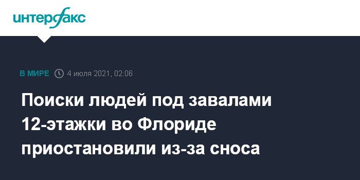 Как заявила мэр округа Майами-Дейд Даниэлла Левин Кава, поисково-спасательные работы на месте обрушения будут приостановлены до соответствующего разрешения официальных лиц. Она не назвала дату сноса, но власти ранее говорили о планах снести сохранившиеся части уже в воскресенье, поскольку к побережью Флориды приближается ураган "Эльза".