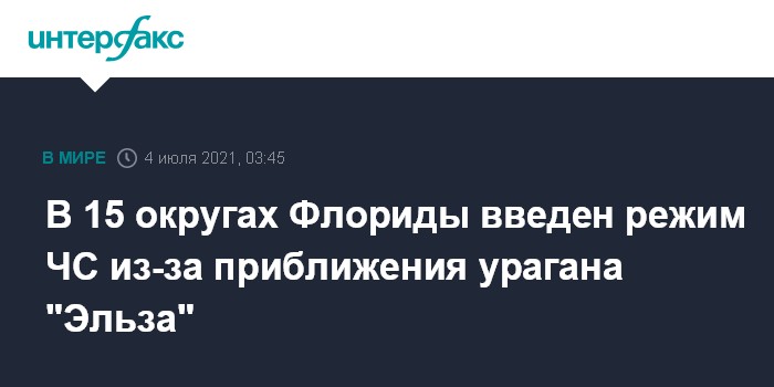 Москва. 4 июля. INTERFAX.RU - Губернатор Флориды Рон Десантис ввел режим чрезвычайной ситуации в 15 округах штата из-за приближения тропического шторма "Эльза". Соответствующее распоряжение и пресс-релиз были опубликованы на официальном сайте губернатора Флориды.