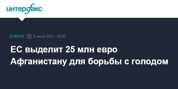 Москва. 5 июля. INTERFAX.RU - Европейский союз сообщил в понедельник о выделении 25 млн евро на срочную гуманитарную помощь Афганистану для борьбы с голодом.