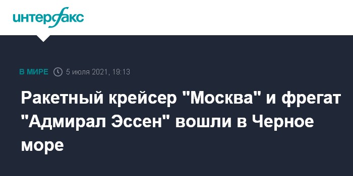 Москва. 5 июля. INTERFAX.RU - Ракетный крейсер "Москва" и фрегат "Адмирал Эссен" в понедельник, пройдя Босфор, вернулись в Черное море, сообщили стамбульские наблюдатели, публикующие фотографии прохождения кораблей через пролив.