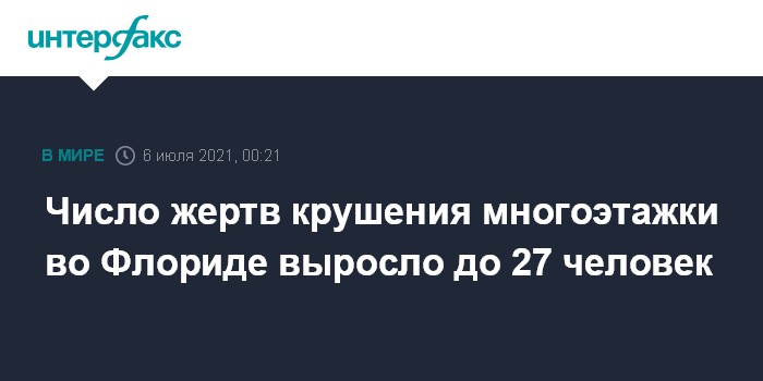 Помощник начальника пожарной службы Майами-Дейд Рейд Джадалла сообщил, что под завалами найдены еще три жертвы. Таким образом, число погибших выросло до 27 человек. Еще 118 человек остаются пропавшими без вести.