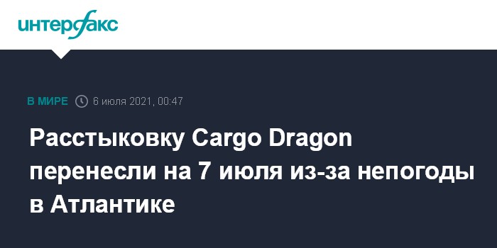 Москва. 6 июля. INTERFAX.RU - Из-за непогоды в районе приводнения в Атлантике вблизи Флориды отстыковка грузового космического корабля многоразового использования Cargo Dragon от Международной космической станции (МКС), планировавшаяся во вторник, перенесена как минимум на 7 июля, сообщило NASA.