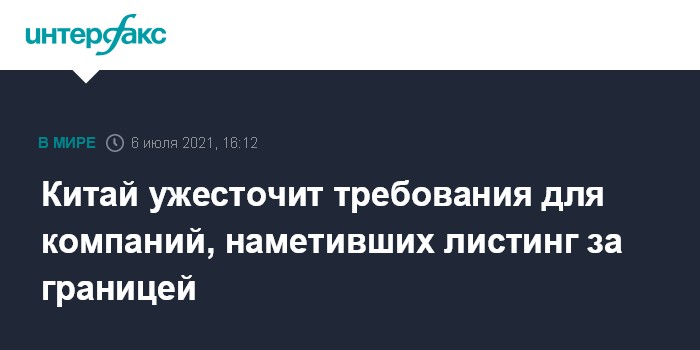 Москва. 6 июля. INTERFAX.RU - В Китае ужесточат требования для компаний, планирующих листинг за рубежом, а также изменят процесс одобрения IPO, что, вероятно, затруднит привлечение китайским бизнесом средств за счет продажи акций в США. Об этом сообщает "Синьхуа".
