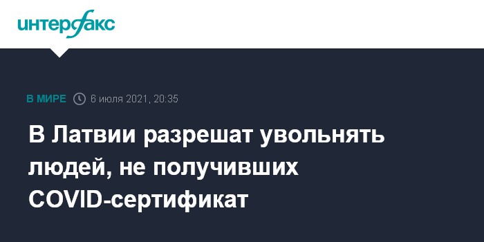 Москва. 6 июля. INTERFAX.RU - В Латвии работодателей наделят правом увольнять, отстранять или переводить на другие должности сотрудников, которые до 15 сентября не получат COVID-сертификат о перенесенной болезни или вакцинации, сообщает латвийское агентство Leta.