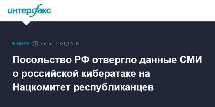 "Обратили внимание на публикацию в Bloomberg от 6 июля о якобы взломе "российскими правительственными хакерами" компьютерных систем Национального комитета республиканской партии. Решительно отвергаем подобные измышления", - говорится в заявлении посольства в фейсбуке.