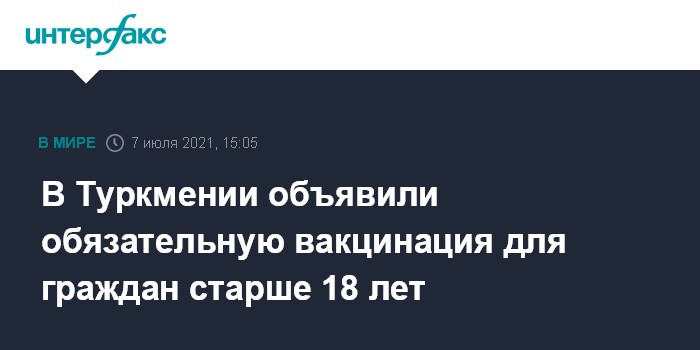 Москва. 7 июля. INTERFAX.RU - В Туркменистане вводится обязательная вакцинация населения старше 18 лет, сообщил Минздрав республики.