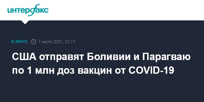 Москва. 7 июля. INTERFAX.RU - Боливия и Парагвай получат от США по 1 млн доз вакцин от COVID-19 от компаний Johnson&Johnson и Pfizer, сообщила в среду пресс-секретарь Белого дома Джен Псаки.