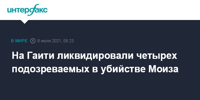 Москва. 8 июля. INTERFAX.RU - Начальник полиции Гаити Леон Шарль сообщил, что четверо подозреваемых в убийстве президента Жовенеля Моиза были ликвидированы, еще двоих задержали.