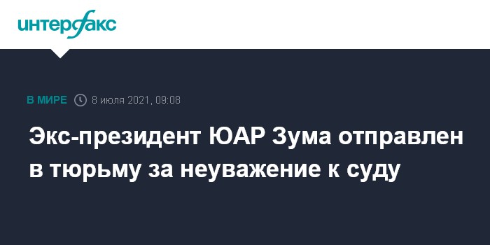 Москва. 8 июля. INTERFAX.RU - Бывший президент ЮАР Джейкоб Зума начал отбывать 15-месячный срок тюремного заключения, к которому его приговорили за проявление неуважения к суду, сообщает в четверг The Guardian.