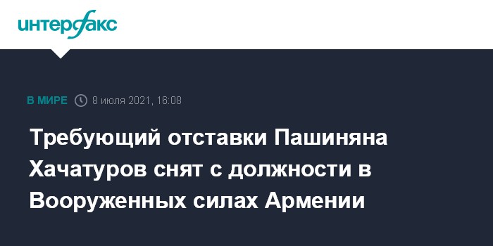 Москва. 8 июля. INTERFAX.RU - Президент Армении Армен Саркисян освободил Григория Хачатурова от должности командующего третьим армейским корпусом Вооруженных сил республики.