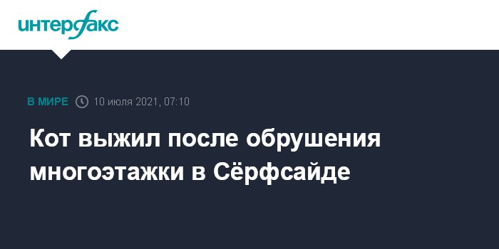 Москва. 10 июля. INTERFAX.RU - Кот обнаружен живым после обрушения жилого многоквартирного дома в городе Сёрфсайд во Флориде, произошедшего более двух недель назад, сообщает NPR.