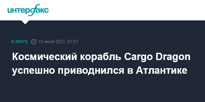 Москва. 10 июля. INTERFAX.RU - Американский грузовой космический корабль Cargo Dragon, отстыковавшийся от Международной космической станции (МКС), в субботу штатно приводнился в Атлантике, сообщила компания-разработчик SpaceX.