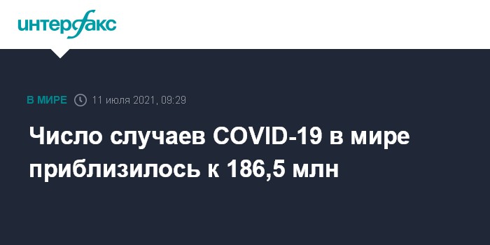 Москва. 11 июля. INTERFAX.RU - Число зарегистрированных случаев заражения коронавирусом COVID-19 в мире на утро воскресенья составило 186 млн 460 тыс. 007, сообщил американский университет Джонса Хопкинса.