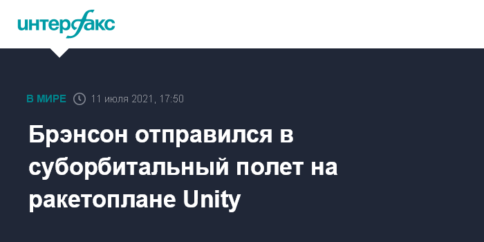 Москва. 11 июля. INTERFAX.RU - Миллиардер Ричард Брэнсон вместе с командой из еще пяти человек отправился в суборбитальный полет на ракетоплане Unity на высоте более 80 километров. На сайте компании Virgin Galactic и в соцсетях ведется прямая трансляция этого события.