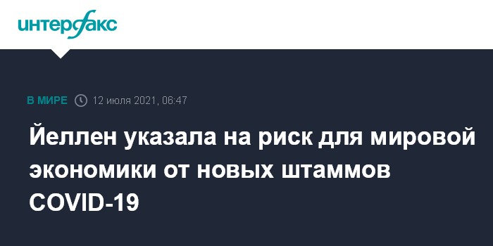 Москва. 12 июля. INTERFAX.RU - Министр финансов США Джанет Йеллен выразила серьезную обеспокоенность в связи с тем, что новые варианты коронавируса могут стать угрозой для восстановления пострадавшей от пандемии мировой экономики, сообщают западные СМИ.