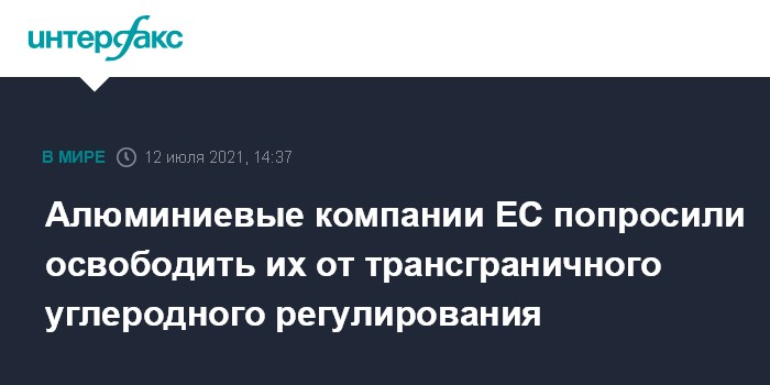 Москва. 12 июля. INTERFAX.RU - European Aluminium призывает исключить алюминиевый сектор из числа отраслей, к которым на первом этапе будет применяться механизм трансграничного углеродного регулирования (carbon border adjustment mechanism, CBAM), предложенный Евросоюзом.