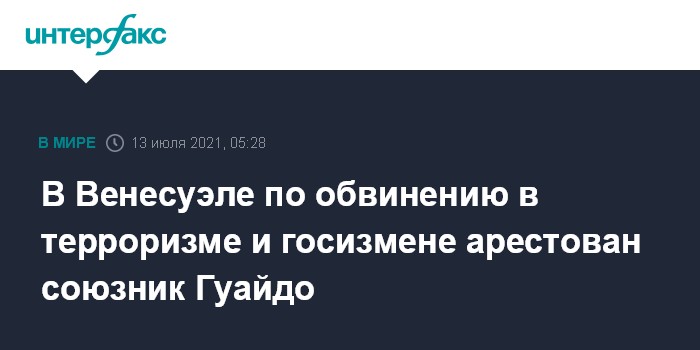 Москва. 13 июля. INTERFAX.RU - Генеральный прокурор Венесуэлы Тарек Уильям-Сааб сообщил, что оппозиционный политик Фредди Гевара арестован по обвинению в терроризме и государственной измене. Гевара считается близким союзником лидера венесуэльской оппозиции Хуана Гуайдо, которого США и ряд других стран считают временным главой государства.