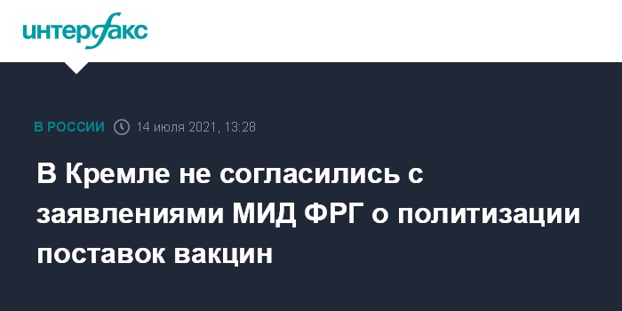 "Мы неоднократно говорили, что мы сами категорически против политизации всего, что связано с вакцинами. Мы категорически не согласны с такой формулировкой", - сказал Песков журналистам, комментируя заявление МИД ФРГ, которое обвинило Россию и Китай в политизации темы поставок вакцин от коронавируса.