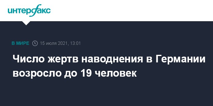 Москва. 15 июля. INTERFAX.RU - Число жертв наводнения на западе Германии возросло до 19 человек, число пропавших без вести после удара стихии оценивается в десятки человек, передает в четверг агентство Associated Press.