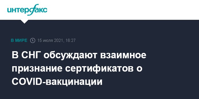 Москва. 15 июля. INTERFAX.RU - Вопрос взаимного признания сертификатов о вакцинации против COVID-19 в странах СНГ обсудили на совещании в четверг, говорится в сообщении на сайте исполнительного комитета Содружества.