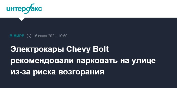 Москва. 15 июля. INTERFAX.RU - General Motors Co. рекомендует владельцам ранее отозванных электромобилей Chevrolet Bolt парковаться на улице после возгорания двух отремонтированных электрокаров.