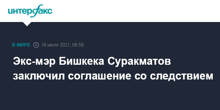 Москва. 16 июля. INTERFAX.RU - Подозреваемый в коррупции экс-мэр Бишкека Азиз Суракматов заключил сделку со следствием, сообщает в пятницу пресс-служба Госкомитета национальной безопасности Киргизии.