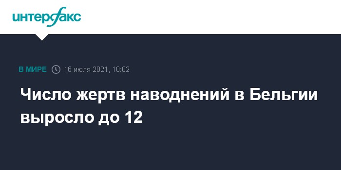 Москва. 16 июля. INTERFAX.RU - Число погибших в результате сильных наводнений в Бельгии увеличилось до 12 человек, сообщает телерадиокомпания RTBF.