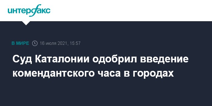 Москва. 16 июля. INTERFAX.RU - Суд Каталонии в пятницу одобрил введение комендантского часа в этом испанском автономном сообществе, где наблюдается самый высокий уровень заболеваемости коронавирусом в стране, передают европейские СМИ.