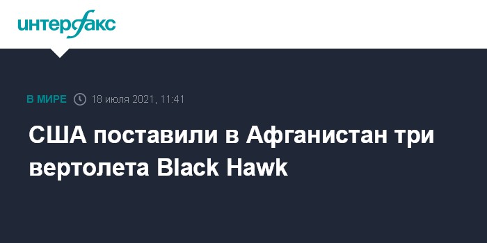 Москва. 18 июля. INTERFAX.RU - Соединенные Штаты предоставили армии Афганистана три вертолета Black Hawk, сообщил пресс-секретарь афганских сил обороны и безопасности генерал Аджмал Омар Шинвари.
